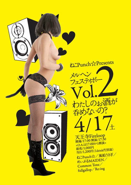 ★4月17日(土)★ 天王寺Fireloop ねこPunch☆ presents 「メルヘンフェスティボーvol.2」 〜わたしのお酒が呑めないの?〜 ねこPunch☆ / Common Tone / 風船うさぎ / fullgallop / めぃぷるMAIDEN / Re:ing [O.A.]ねこりんとん☆(17:00〜) 開場/17:00 開演/17:30 前売/\1,000 当日/\1,200