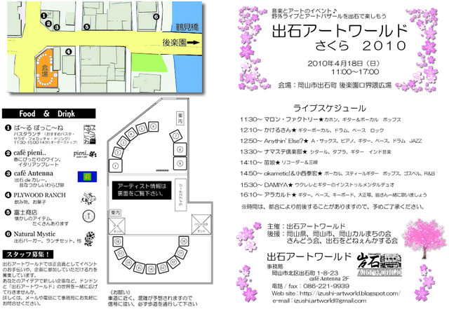 11日に雨天の為、18日に開催します! どうやら今度はお天気問題なさそうです!! インド音楽、J-OPP、ロック、JAZZ、ゴスペル、三線、ウクレレなどなど 多彩な面々を取り揃えていますので きっとみな様を飽きさせないと思います のぞきに来て下さ〜い! ■入場無料!■ 出石アートワールド さくら 2010 日時:2010年4月18日(日)11:00〜17:00 会場:岡山市北区出石町 後楽園口交差点界隈広場 http://izushi-artworld.blogspot.com/ ■ライブ 11:30〜 マロン・ファクトリー★カホン、ギタ