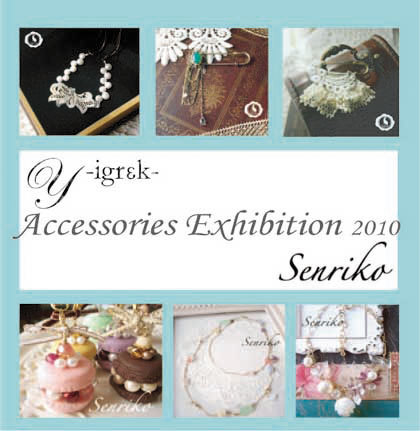 こんにちは。Senrikoと申します。 ワークショップなどを一緒に行っているお友達のigrekさんと二人で ギャラリー展示をさせていただきます。 igrek×Senriko『Accessories Exhibition 2010』 2010.4.19(mon)〜25(sun) 12:00〜18:00(初日13:00〜/最終日〜17:00) レースやリボン アンティークビーズにキラキラジュエリー。 思わず食べたくなるようなスイーツモチーフ。 お気に入りのアクセサリーを眺める甘く幸せな時間をイメージして、 女の子が心ときめくアイテムを集めました。 みなさまのお気に入りも見つかると嬉しいです