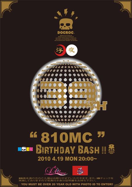 DOCROC.810MC☆BIRTHDAY BASH!! 2010.4.19の是非のお誘いです。お友達もご一緒に!! <photo src="47731926:4289319660"><photo src="47731926:2993570343"> <photo src="47731926:700304789"> スケジュール 20:00 OPEN!! DJ TIME 21:30〜 ロベルト・杉浦 ライヴ!! 21:50〜 GUEST ダンス 22:20〜 フリースタイル・フットボール 22:50〜 我武者羅應援團パフォーマンス 23:10〜 女子大生サークルTEAM バースディーコール 23:25〜 『我龍真吾』VS 『銀次郎』 スパーリングで対決! 23:4