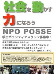 NPO法人POSSEのまなちんと申します。 ボランティア募集説明会のご紹介です。 ------------------------------------------------------------- 「社会を動かす力になろう」 NPO法人POSSE 学生ボランティア募集説明会 ------------------------------------------------------------- ボランティア募集説明会のお知らせです。 東京では4月中、下記の日程の通り、各大学で説明会を行います。 格差や貧困をなんとかしたい! 社会に貢献したい! 困っている人の力になりたい! 若者が社会参画できる場をもっ