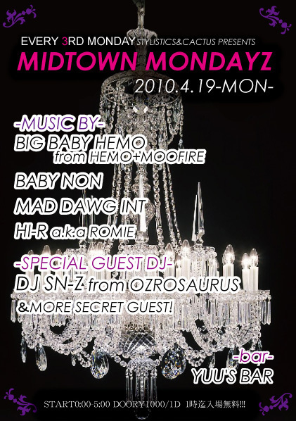 管理人様告知失礼致します。 月曜日の居酒屋cactus の後 そのまま深夜o時からは 新しく始まるdance 『mid town mondayz』の幕開け!!!! 今迄になかったスタイルで御届けします! check it !!!!!!!!!!!!! 秘密な内容詳しくはこちら! http://ameblo.jp/baby-non/ stylistis & cactus presents 『MIDTOWN MONDAYZ』 @club CACTUS 東京都港区南青山1-15-18 リーラ乃木坂B1F TEL:03-3408-9577 http://clubcactus.jp START0:00-5:00 DOOR¥1000/1D 1時迄入場無料!!! ◆MUSIC BY BIG BABY HEM