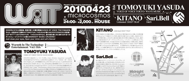 管理人様告知失礼します、不適切な場合削除お願いします。 2009年にNYから帰国後、奇数月第二木曜日開催のVOICE OF VOICE TOKYO@AIRを中心に、全国各地で活躍中のTOMOYUKI YASUDAが遂にMICROCOSMOSに初登場!この “WITT”とはTOMOYUKI YASUDAを中心に、彼の盟友達と共に繰り出す全てのダンスミュージックファンに贈るMIDNIGHT MUSIC CRUISING! Just close your eyes, Open your mind, and Let’s Dance!    4.23. (FRI)WITT @microcosmos DJs TOMOYUKI YASUDA (VOICE OF VOICE TOKYO/ WAVE MUSIC), KITANO(Unlimited/DEEP TR