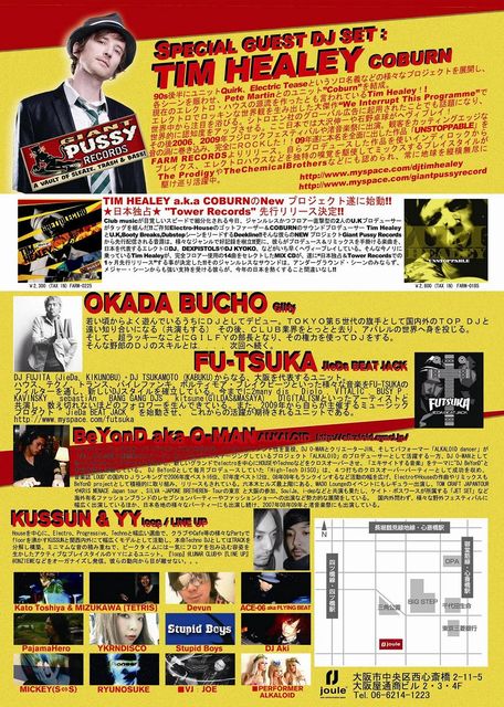 チケットも取り扱っています。 お気軽にメッセージ下さい♪ ProdigyやTheChemicalBrothersも認めた、現在のエレクトロ・ハウスの源流を作ったとも言われている Pete Martinとのユニット”Coburn”の相方、「Tim Healey」が大阪JOULEに登場! 彼の曲はここ日本では大沢伸一や石野卓球、DEXPISTOLS、DJ KYOKOがヘヴィプレイ!2006、2009年フジロックフェスティバルや渚音楽祭に出演。観客をカッティングエッジな音の渦に巻き込み、完全にROCKした!アパレルブランド「MAISON GILFY」のバックアップもあり、ゲストDJにGILFYから「OKADA BUC