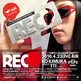 こんにちは♪ いよいよ来週はREC●です! 大変遅くなりましたが、、 次回のREC●情報を告知します。 みなさん、帽子とメガネを用意して オシャレして遊びにきてくださいね! 2010.4.23 FRI REC●@ AIR -HATS & GLASSES PARTY- DJ: KO KIMURA (FUTIC RECORDINGS TOKYO) Support DJ: TTI (3+4BEATS) Lounge DJs: ENUOH (10CountBlock / Caizoc), Maezawa (Ptolemy), 墨 (DAZZLE PRODUCTIONS),SK (Swung) Sound Tune-Up : Valkyrie Visual Production: CHIMAERA CRAFT Food: Kitchika Tarot: Yuki OPEN: 22:00 DOOR: 30
