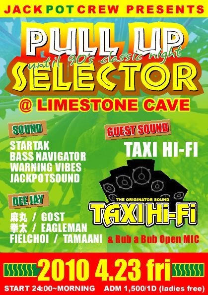 管理人様告知失礼します 2010/4/23(金) JACKPOT CREW PRESENTS "PULL UP SELECTOR" ~CLASSIC NIGHT SPECIAL~ @横浜元町LIMESTONE CAVE START 24:00〜MORNING ADM \1,500/1D(LADIES FREE) <SPECIAL GUEST SOUND> TAXI Hi Fi <SOUND> STAR TAK BASS NAVIGATOR WARNING VIBES JACKPOT SOUND <DEE JAY> 麻丸 GOST 拳太 EAGLE MAN FIELCHOI TAMA ANT 前回の二月のBAND SPECIALの大好評に引き続き、今回はSOUND NIGHT。 しかも、お題は90'sまで限定のCLASSIC SPECIAL NIGHTです。
