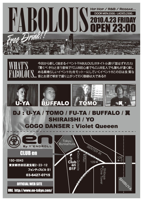 管理人様告知失礼します!!! ご迷惑でしたら消去もしくはメッセージ頂けるとありがたいです!!! やってまいりましたーーー!!! 4月23日(金曜)渋谷CLUB『エン』(元CLUB『PURE』もしくは『Xanadu』)にて (集客人数350〜400人ぐらい入るCLUBです!!!広いです!!!) 飲み放題!!!さらに出入り自由!!!のDJonlyイベント!!! 『FABULOUS!!!』 しかもしかもメッセージ頂ければな〜んと!!! LADIES \2000円 MENS \3000円 週末なのにこの金額で夜23時〜朝5時までず〜っと『飲み放題』です!!!(言わば『The 六本木style』ですね!!!) 中途