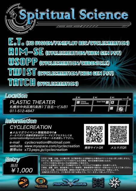 管理人様告知失礼致します。 4月23日(金)、2010年CYCLE CREATION第一弾の週末PARTYです! 今冬に眠っていた最新キラートラックが飛び交う事間違いなし!! 桜前線という春の変わり目を前にスピリチュアルに造りあげられた空間にCYCLE CREATIONが化学反応を起こします! そしてDOOR ONLY 1000円ですので気軽に足をお運びください!お待ちしております! CYCLECREATION presents ■SPIRITUAL SCIENCE■ 2010 4/23 (fri) Start 23:00 @PLASTIC THEATER ■DJ E.T. (3D VISION/FINEPLAY REC/CYCLECREATION) R
