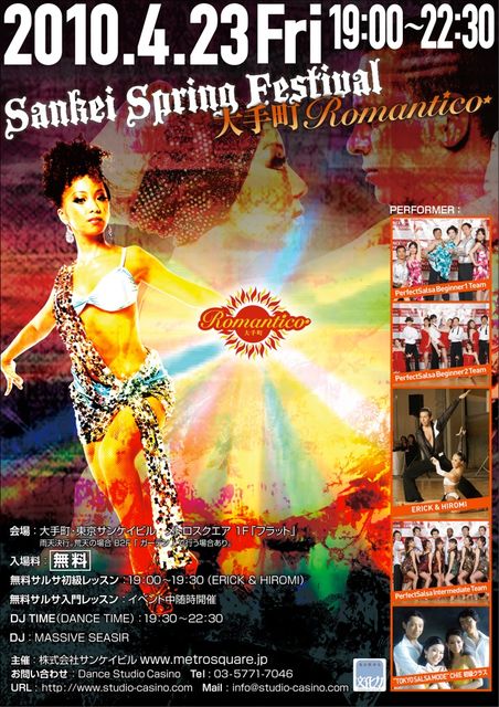 ★“Sankei Spring Festival“「大手町Romantico」★ どなたでも参加できる入場無料の野外イベントです。盛り上がりは必至です! 日時:2010.4.23(金)19:00〜22:30 会場:大手町・東京サンケイビル メトロスクエア 1F「フラット」 雨天決行。荒天の場合「B2F ガーデン」で行う場合あり。 入場料:無料 無料サルサ初級レッスン:19:00〜19:30(ERICK&HIROMI) 無料サルサ入門レッスン:イベント中随時開催 DJ TIME(DANCE TIME):19:30〜22:00(予定) DJ:MASSIVE SEASIR PERFORMER: PerfectSalsa Beginner