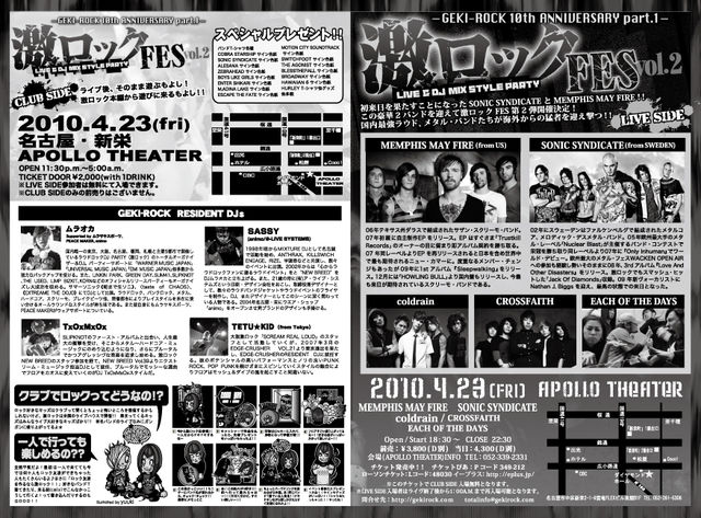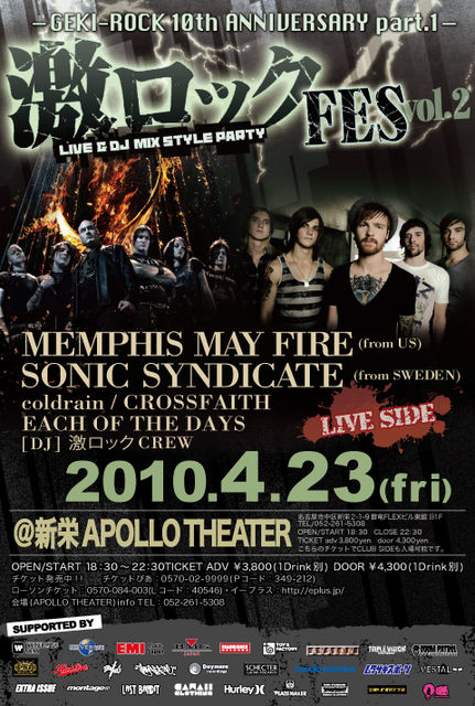 夕方からの激ロックFES.ではスウェーデンからSONIC SYNDICATEがアメリカからMEMPHIS MAY FIRE、そして名古屋のロックシーンを牽引するCOLDRAIN、EACH OF THE DAYという2バンドが参戦!!