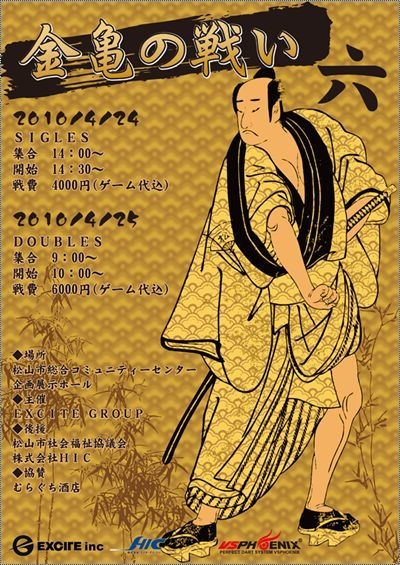 2010/4/24,25 金亀の戦い 6 24日(土) シングルス戦 25日(日) ダブルス戦 ※ 概 要 ※ ◆日時◆ 2010年4月24日(土)、25日(日) ◆会場◆ 松山市総合コミュニティーセンター企画展示ホール 愛媛県松山市湊町7丁目5 089-921-8222 ◆FEE:24日◆ シングルス \4000- (ゲーム代)込み ◆FEE:25日◆ ダブルス \6000- (お食事券)+(ゲーム代)込み ◆ゲームラウンド数◆ 301:10R 501:15R 701:15R STC:15R ◆主催◆ エキサイト グループ ◆お問合せ先◆ 有限会社エキ