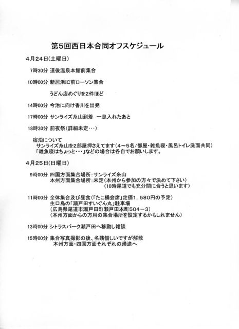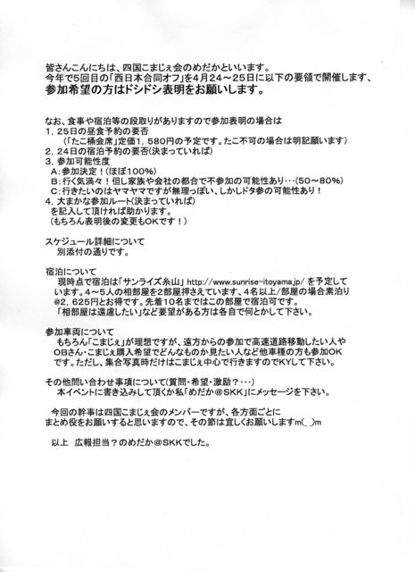 皆さんこんにちは、四国こまじぇ会のめだかです。 告知させてください 「第5回西日本合同オフ」を4月24〜25日に以下の要領で開催します。 今年こそ24日をプチうどんツー・25日を本番とします、もちろんどちらか の日だけの参加でもOKです。 参加希望の方はドシドシ表明をお願いします。 なお、食事や宿泊等の段取りがありますので参加表明の場合は 24日の前夜祭(金額・内容未定・・・)参加の有無 24日の宿泊の有無 25日の昼食予約(1,580円のたこ料理)の有無 参加可能性度