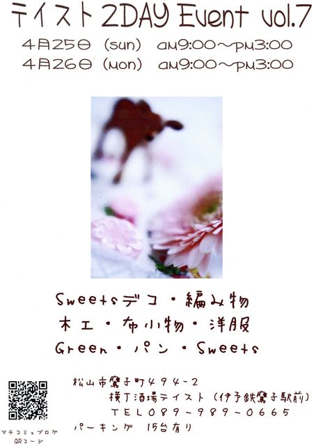 4月25日(sun)am9:00〜pm3:00 4月26日(mon)am9:00〜pm3:00 Sweetsデコ・編み物 木工・布小物・洋服 Green・パン・Sweets 松山市鷹子町494-2 横丁酒場テイスト(伊予鉄鷹子駅前) Tel 089-989-0665 パーキング 15台有り