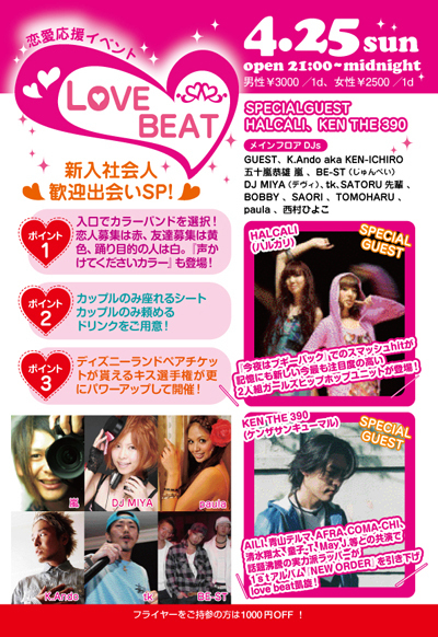 毎回1000人規模のイベントです 年末クリスマスイブは1900人 今年の2月は1300人 3月は1250人 勢い半端内です 過去のゲストには BK(湘南乃風)、紅音ほたる、CHEERの家族〜渋谷本店〜(若槻千夏)、DJ KOO(TRF)阪井あゆみ、梅しゃん,JOY,SoulJa,やついいいちろう(エレキコミック)などなど話題の方々が出演 4月25日に!! コミュも参加してくださいね! http://mixi.jp/view_community.pl?id=4262043 日本最大規模のイベント「LOVE BEAT」