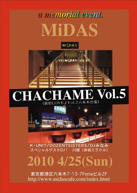 お待たせしました〜 今回のイベントはすごいよ〜 新宿LOVEでお世話になってる クニさんのバンド。K-UNIT の演奏と 新宿LOVEの合体です! スペシャルゲストはなんと!DJ川畑氏です。 生演奏とDJPLAYで 踊りましょう〜 4月25日(日)、六本木MiDS http://www.midascafe.com/ CHACHAME Vol.5×新宿LOVE♪Vol.7六本木出張 http://www.ustream.tv/recorded/5767209 ************************ 男性 ¥3,000(2ドリンク) 女性 ¥2,500(2ドリンク) 18:30〜23:00過ぎ *************