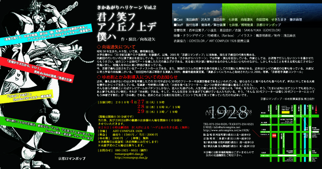 こんにちは、京都を拠点に活動しております劇団、京都ロマンポップです。 4月末にアートコンプレックス1928にて公演を行うことが決定しました。三条通り にお越しの際は是非お立ち寄りください★コント公演ですので、「芝居はちょっと敷居が高いかも・・」とお思いの方も楽しめる公演になっているかと思います。 以下詳細になります! 京都ロマンポップのさかあがりハリケーンvol.2 「君ノ笑フアノ丘ノ上デ僕ハ」 作・演出:向坂達矢 ART COMPLEX1928提携公演 ■日時 2010年4月27日(火)19時〜 28日(水)16時〜/1