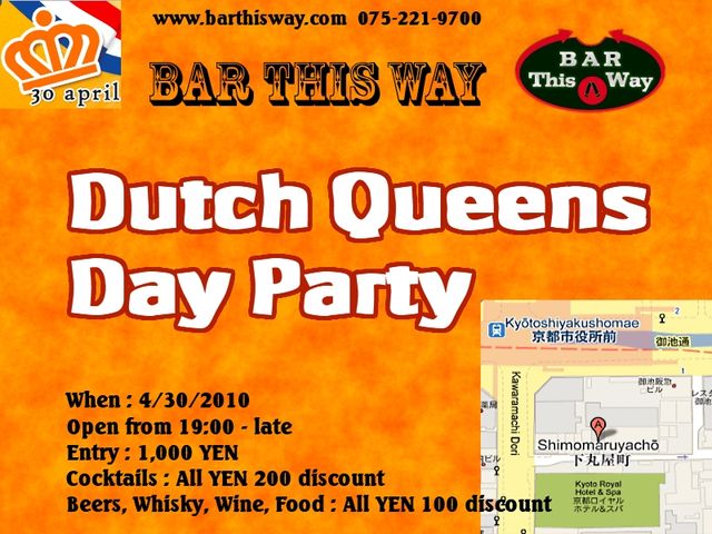 4月30日(金曜日)BarThisWayでパーティーがあります。エントリー¥1000でカクテル全部¥200割引き、他のフードやドリンク¥100割引きになります! オレンジ服に着たら、フリードリンクチャンスもあります! Time : 19:00 - late