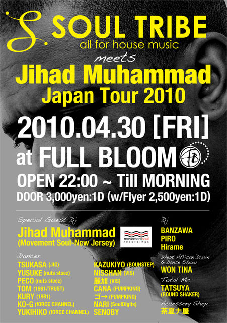 4/30(金曜)、大阪にて開催されているハウスパーティー、"SOUL TRIBE"にてニュージャージーよりJihad Muhammadが約2年ぶりに再来日します!!ショーケースも豪華です!!