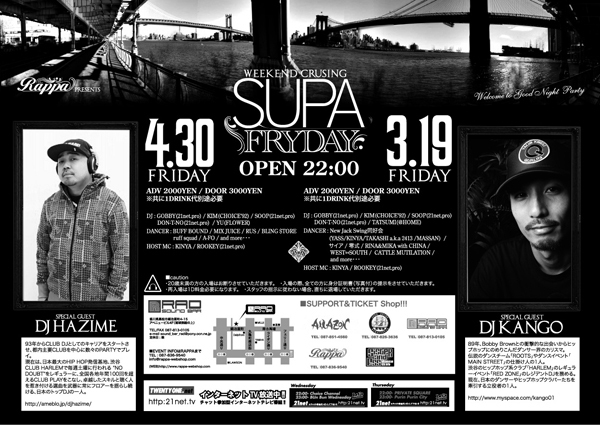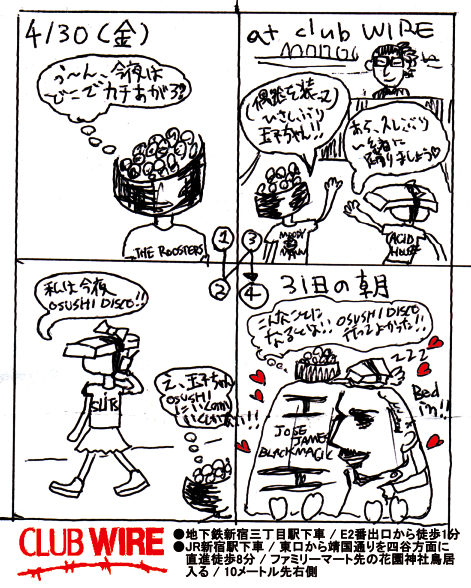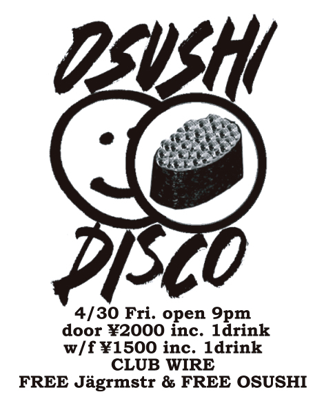 ここのところ寒いんだか暑いんだか分かりませんね、アガってるんだかアガってないんだかも、、、いや、それはアガってるに決まってるっしょ。て感じで4月の最終日の金曜日、あなたの週末にOSUSHI DISCOを取り入れてみてはどうでしょうか?あるハズもない31日に迷い込むのが嫌じゃなければネ、、、。今回もイエーガーチャージしながら寿司でも食って『もう動けない、、、ダメ、、、』ってなるまで踊