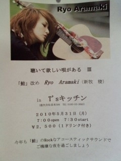 聴いて欲しい唄がある 「鮭」改め 『Ryo Aramaki(新牧 稜)』in T'sキッチン 日付 2010年5月31日(月) 場所 T'skitchen(能代市松長布308 TEL:0185-53-3665) 時間 7:00open 7:30start 銭こ ¥2,500(1ドリンク付き) 問い合わせ・090-5236-4323(IKKO) openact M.I. 新牧 稜HP http://www.ryo-aramaki.net/ 野村のよっちゃんからのアコギ一本で全国を渡る女の子 小さい体からは信じられない存在感 今年も「鮭」のRockなアコースティックサウンドでご機嫌な夜を過ごしましょう あ o