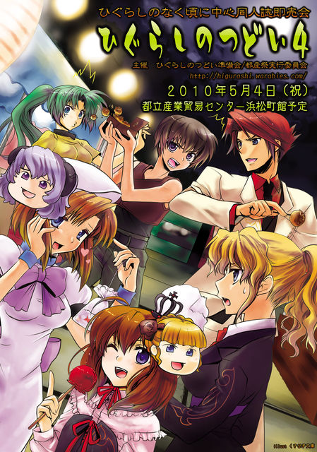 すみません、スペースをお借りしてしまいます 「ひぐらしのつどい・4」を 2010年5月4日(日)都立産業貿易センター浜松町館 都産祭の中にて開催する事になりました 都産祭HP http://tosanmatsuri.sokubaikai.com/ ※旧アドレスのhigurashiの部分をtosanmatsuriに変更でいけます 「ひぐらしのつどい・4」の専用HPについては 「ひぐらしのつどい準備会」の新しいHPである以下 「http://higurashi.warabies.com」へお願いいたします 移転に伴い、2010年1月末をもって旧HPを 閉鎖させていただきました事もお知らせ