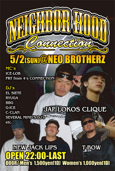 【NEIGHBOR HOOD CONNECTION】 vol.3 5月2日(sun) @NeoBrotherz open 22:00〜 DOOR Mens1500(1D) Lady1000(1D) ◇MC Jap Lokos Clique T-BOW New Jack Lips ICE Rob FRT from 4'SCONNECTION ◇DJ SMOKE-D(山形自慰街) C-CLAN(山形自慰街) EL Siete RYUGA BBG G-ICE YOKO-G 仙台唯一のG-RAPイベント! ウエッサイ、チカーノ、レゲトンなどをメインにガンガン流れます! テキーラもFREEです! GWはネイバーで楽しみましょっ!!