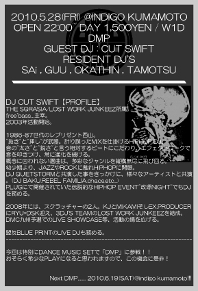1986-7世代を牽引するHIP HOP DJのCUT SWIFTが、今回はDANCE MUSIC SETでDMPに殴り込みです!
