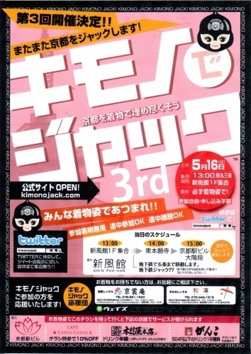 今度のジャックは「地下鉄ジャック」!? 13:00 京都・三条烏丸にある新風館の1階広場に集合! http://www.shin-puh-kan.com/ 市営地下鉄で烏丸御池〜五条まで移動。ザッツ地下鉄ジャック!! (なのであらかじめ210円の切符をご購入いただくか、210円を握りしめて集合!) 14:00 東本願寺で一旦集合! 京都タワーを眺めながら徒歩で京都駅ビル大階段を目指します! 15:00 あのガメラも大暴れした駅ビル大階段を、キモノ姿でジャックしましょう! ゆる〜い企画なので、途中参加も途中離脱もOK! とにかく「ドレスコード: