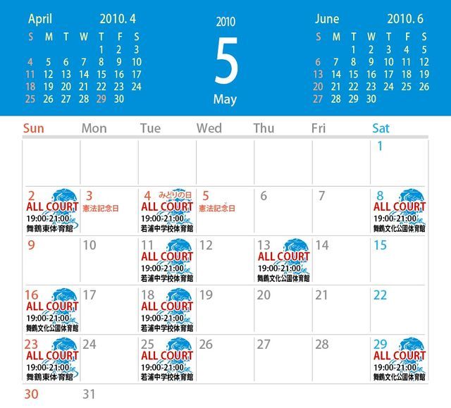 ■日付:05月18日(火) ■時間:19:00〜21:00 ■場所:舞鶴市立若浦中学校 体育館 ■内容:公式練習 ■持物:練習用ユニフォーム(青色) ■備考:ストレッチは必ずしましょう!! ※チーム分けにつきましては、当日にまさおさん、しまださんで取り合いをしてもらいます!! ※参加人数が増えると練習内容も色々出来るので、みなさん参加して楽しみましょう!!
