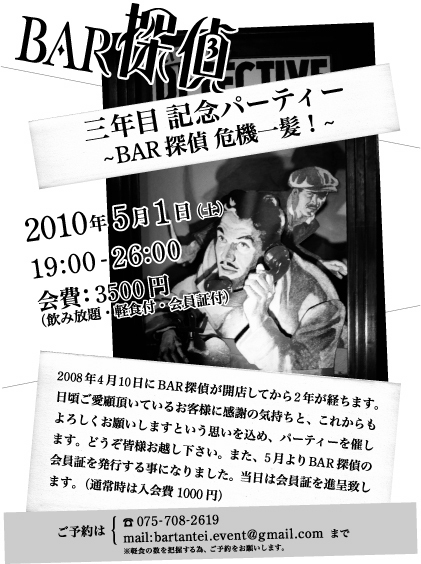 BAR探偵三年目記念パーティ BAR探偵は今月10日に、開店してから二年経ちます。 奇跡的に二年も経ってしまいましたが、 これは来店してくださりご愛顧頂いているお客様のおかげであります。 どうもありがとうございます。 さて感謝の気持ちと、 これからも御願いしますという思いを込め、 パーティを開きます。 どうぞ皆様お越し下さい。 また、5月からBAR探偵は会員特典付きの会員証を発行します。 当日はご来店の方に進呈致します。 ※会員番号が500番から800番まで作る事になりました。 ご希望の番号がある場合は事前にお