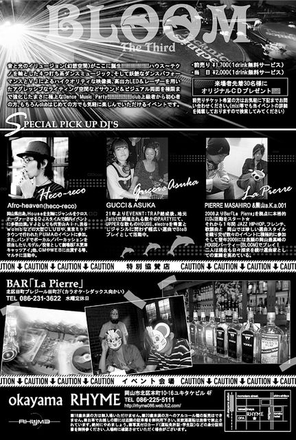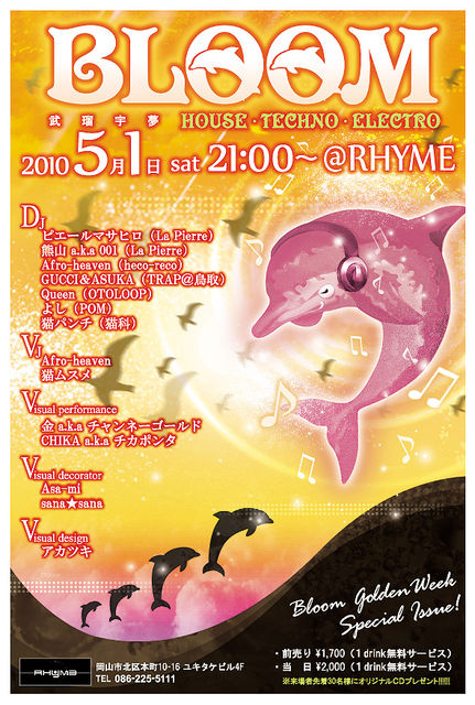 管理人様、告知失礼いたします、 半年に1度のHOUSE MUSIC祭り、 BLOOM第3弾!!!!!!! 今年もゴールデンウィーク初日、5月1日(土)21時〜より始動です!!!!!!!!!!!!!!! ◆BLOOM◆(武瑠宇夢) 音と光のイリュージョン(幻想空間)がここに誕生!!!!!!!!!!!!!!!!!!!! ハウス〜テクノを軸とした4つ打ち系ダンスミュージック、そして妖艶なダンスパフォーマンスとVJによるハイクオリティな映像美、高出力LED&レーザーを用いたアグレッシブなライティング空間などサウンド&ビジュアル両面を極限まで強化したまさに極上なD