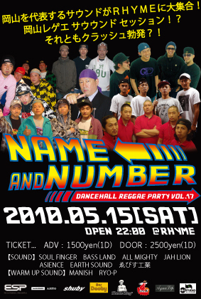 こんちわー このイベント告知をご覧頂いている皆さん、今週土曜日はRHYMEに 決まりですね 普段とは違う「N&N」になるみたいですよ どうやら主催のゑびす工業が企んでるみたいなんで それでは詳細っす!!! 5.15は岡山を代表するサウンドがRHYMEに大集合! 岡山レゲエ サウウンド セッション!? それとも クラッシュ勃発?! この日は各サウンド、自慢のヤバいダブプレートから、危ない45が飛び交うこと間違いなし! 普段のダンスでは なかなか見れないハードコアな熱い夜に
