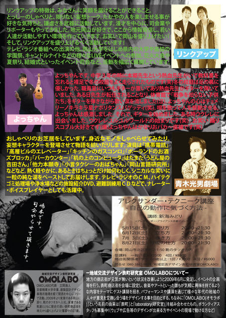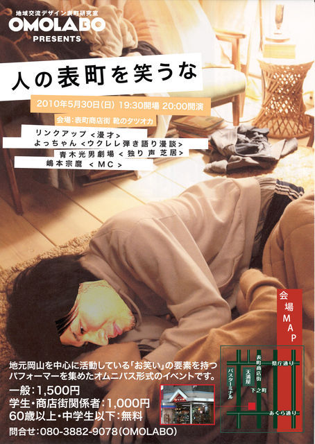 表町商店街にて行われるイベントのお知らせです。 地元岡山を中心に活動している「お笑い」の要素を持つ パフォーマーを集めたオムニバス形式のイベントです。 [ 人の表町を笑うな ] 日程:2010年5月30日(日) 会場:表町商店街「靴のタツオカ」店内特設会場 開場:19:30 開演:20:00 〜 21:30終演予定 出演:リンクアップ <漫才> よっちゃん <ウクレレ弾き語り漫談> 青木光男劇場 <一人声芝居> 一般:\1,500 学生・商店街関係者:\1