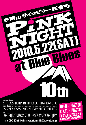 おかげさまで10回目を迎えることができました。 よろしくお願いします。 岡山サイコビリー狂会主催 PINK NIGHT vol.10 2010.5.22(SAT) at BLUE BLUES (岡山市表町3丁目12-12) 086-227-5000 OPEN19:00/START19:30 TICKET ¥2000(ADV)/¥2500(DOOR) +DRINK¥500 BAND: SPIDERZ(大阪) http://www.sol.dti.ne.jp/aile/spiderz/index2.html DOLPHIN KICK(大阪) http://dolphinkick.cool.ne.jp/ ゴッサム団長(千葉) http://www.gothamdancho.com/ ANNY SWINGIN GIMME GIMMIES DJ: タケシJET/猫/SE