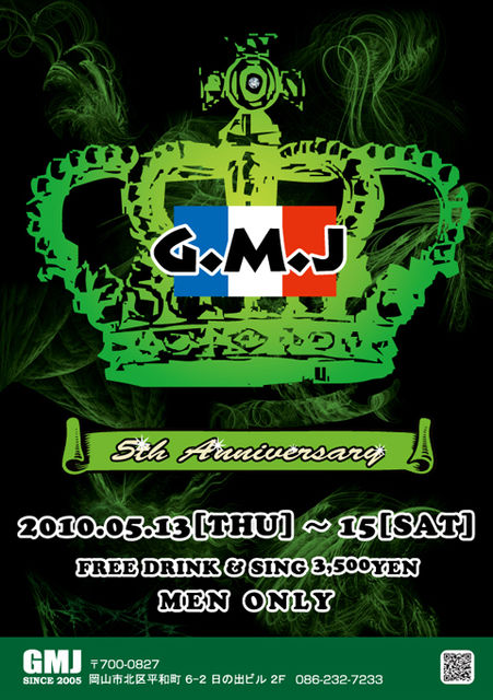 お陰様でGMJも間もなく5周年! 支えて下さっている皆様、いつも本当にありがとうございます! 感謝の気持ちをぎゅっとたっくさん込めまして、今年も周年パーティーを3日間させて頂きます☆ ■GMJ 5th Anniversary!!■ 5月13日(木) MIX 14日(金) Men Only 15日(土) Men only 19時開店 飲み放題歌い放題 \3,500 今年はスタッフも賑やかです。 シゲ 陸 義雄 雄太 の4人でおもてなし致します♪ 賑やか4人でどんな営業になるのか想像もつきません。(笑) 是非遊びにいらしてください。 スタッフ一同お待ちしております! マスター シ