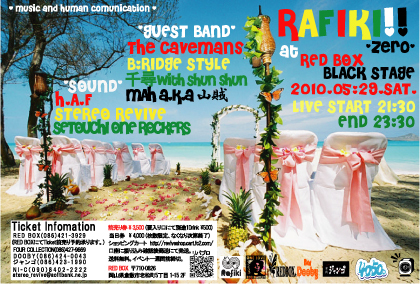 管理人様、告知スペースをお借りします。 中国地方まれにみない3バンド競演ライブをおこないます。 皆さん、ご存知、The Cavemans,B:RIDGE STYLE,千尋と豪華な顔ぶれ。 もう、軽くフェス級ですね。 これは間違いなく遊びに来ていただきたいです。 チケットに限りがあるのでお早めにお買い求めください。 私にメッセージをいただいても手配できることも出来るのでお問い合わせください。 --------------------------------------------------------------- 05/29(SAT) 『Rafiki』-ZERO- LIVE START 21:30 END 23:30 (