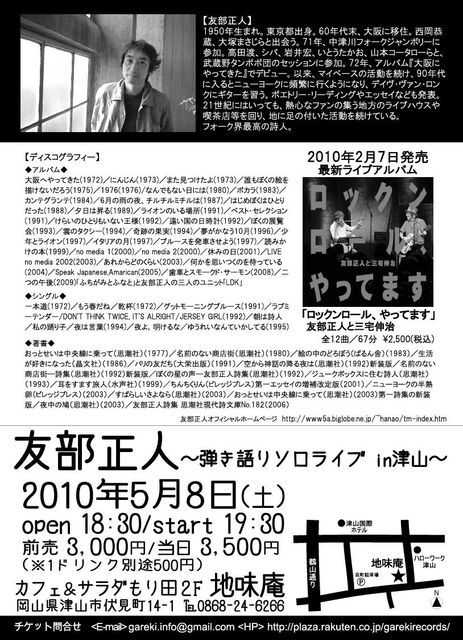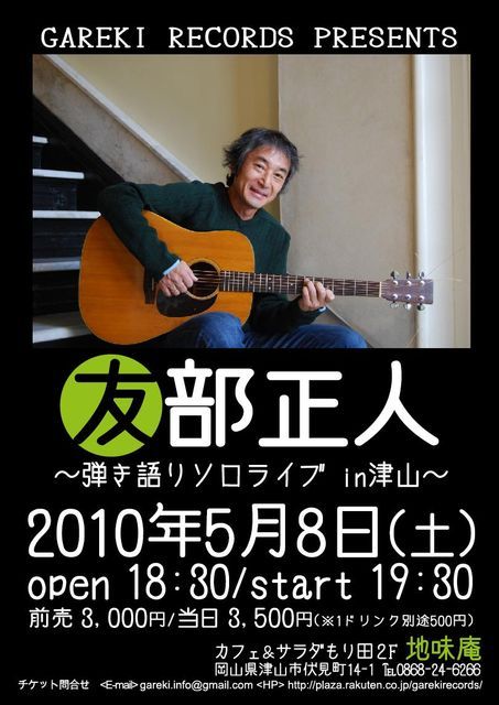 GAREKI RECORDS PRESENTS 「友部正人〜弾き語りソロライブ in津山〜」 【会場】カフェ&サラダもり田2F 地味庵 (岡山県津山市伏見町14-1) 【日時】2010年5月8日(土) open 18:30/start 19:30 【料金】前売3,000円/当日3,500円(※1ドリンク別途500円)