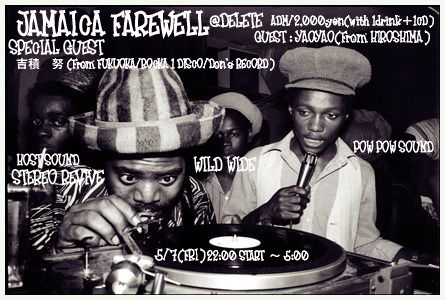 3,5,7,9,11月にDELETEでおこなわれているJAMAICA FAREWELLのお知らせです。 l前回のレゲエ和尚氏から2ヶ月経った今回の5月は、1991年から福岡でレゲエレコードショップDon's Recordsを構え、2003年頃から、ROCKA 1 DISCOを結成した吉積 努氏(Don aka Early D)が岡山にやってきます。 ROCKA 1 DISCOというこだわりのサウンドを率い、そしてレゲエ黎明期より数々のJAMAICAN MUSICと出会い、届けてきたセレクトは説得力が違うと思います。 そして、広島よりYAOYAO。 中南米の音楽、カリプソなどのJAMAICAN CLASSICを軸にDJをしイベンターとし