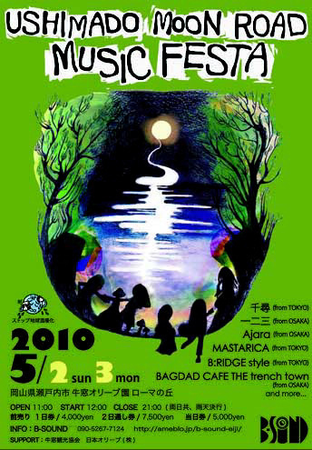 USHIMADO MOON ROAD MUSIC FESTA 2010 日時:5月2日(日) 3日(月) (雨天決行) OPEN 11:00 START 12:00 CLOSE 21:00 (両日共) 場所:岡山県瀬戸内市牛窓オリーブ園ローマの丘 チケット:前売り 1日券/4000yen 2日通し券/7500yen 当日券/5000yen (4月1日発売予定) 出演アーティスト: BAGDAD CAFE THE trench town (from osaka) B:RIDGE style (from tokyo) MASTARICA (from tokyo) Ajara (from osaka)