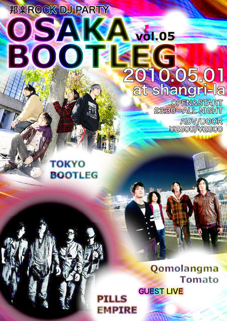 100%邦楽ROCK!!日本のROCKオンリーで歌って踊れるDJ&LIVE PARTYです。 DJ BOOTH必須のキラーチューンから新進気鋭の若手BANDまで、 踊って歌ってクラップしてモッシュしてダイブもしちゃってお酒も飲んでテキーラ一気!(笑) 勿論それを後ろで楽しんでもらっても 日本のROCKの美しさを一緒に追い求めてゆきましょう 皆様のお越しを心よりお待ちしております OSAKA BOOTLEG VOL.5 2010/05/01(土曜日)@ 梅田Shangri-la OPEN 23:30 / START 23:30 ADV.\2,500 /