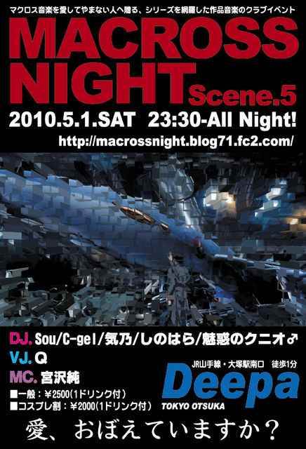 3月のマクロスナイトは過去最大級の盛り上がりでした! それを追い越す事は出来るのか! 初夏のマクロスナイト「Scene. 5」の告知解禁です! ☆☆☆☆☆☆☆☆☆☆☆☆☆☆☆☆☆☆☆☆☆☆☆☆☆☆☆ ≪MACROSS NIGHT Scene.5 〜初夏の大三角形〜≫ マクロスファンの有志による、 マクロス作品と音楽をこよなく愛してやまない人へ贈る、 マクロスシリーズの全てを網羅した作品音楽の祭典! そんな皆さんの為のDJパーティーです! 入学、新入社員シーズンも一段落。 気付いたらあれ・・・まだ友達出来てない・・・・ な