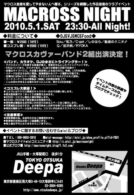 3月のマクロスナイトは過去最大級の盛り上がりでした! それを追い越す事は出来るのか! 初夏のマクロスナイト「Scene. 5」の告知解禁です! ☆☆☆☆☆☆☆☆☆☆☆☆☆☆☆☆☆☆☆☆☆☆☆☆☆☆☆ ≪MACROSS NIGHT Scene.5 〜初夏の大三角形〜≫ マクロスファンの有志による、 マクロス作品と音楽をこよなく愛してやまない人へ贈る、 マクロスシリーズの全てを網羅した作品音楽の祭典! そんな皆さんの為のDJパーティーです! 入学、新入社員シーズンも一段落。 気付いたらあれ・・・まだ友達出来てない・・・・ なーん