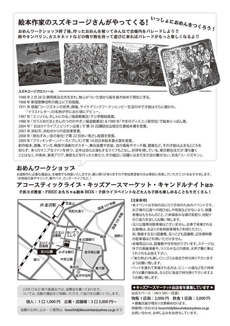管理人様、告知失礼いたしますm(._.)m 「LOVE CHILD」 5月5日(水)子供の日 (雨天決行 ※荒天・天災時にはイベントを中止させていただく可能性がございますので、予めご了承下さい。) 午前10:00〜午後18:00 玉川公園(金沢市玉川町) 入場無料 ・スズキコージさん(絵本作家)による、おめんワークショプ ※お面制作に必要な備品は、主催側でも用意いたしますが、数に限りがありますので参加希望者の方は事前に用意していただくコトをおすすめします。 (水性絵の具やマジック、筆やハケ、カッターナイフなど。) ワークショップ終