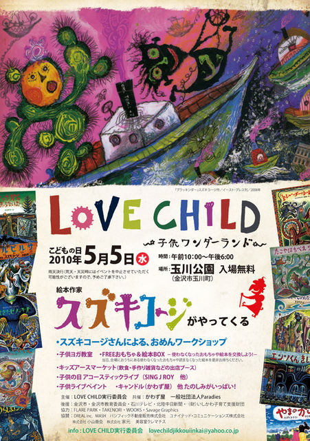 管理人様、告知失礼いたしますm(._.)m 「LOVE CHILD」 5月5日(水)子供の日 (雨天決行 ※荒天・天災時にはイベントを中止させていただく可能性がございますので、予めご了承下さい。) 午前10:00〜午後18:00 玉川公園(金沢市玉川町) 入場無料 ・スズキコージさん(絵本作家)による、おめんワークショプ ※お面制作に必要な備品は、主催側でも用意いたしますが、数に限りがありますので参加希望者の方は事前に用意していただくコトをおすすめします。 (水性絵の具やマジック、筆やハケ、カッターナイフなど。) ワークショップ