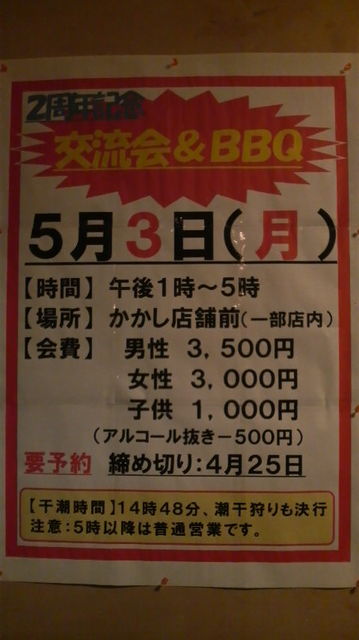 5月3日を予定していましたが 急遽5月5日に変更となりました 恒例の『かかしBBQ』が決まりました (今回は『交流会』ってのが付いてるのがチョット気になるけど。。) 写真では解りにくいので詳細は 5月5日(水) 【時間】午後1時〜5時 【場所】かかし店舗前(一部店内) 【会費】男子 3500円 女子 3000円 子供 1000円 (アルコール抜き-500円) 要予約!締め切り:4月27日 【干潮時間】14時48分、潮干狩りも決行! 注意:午後5時以降は普通営業です。