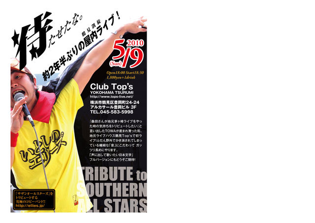 なんとエリーズ2年3ヶ月ぶりの屋内ライブハウスでのLIVEです! お陰さまで今年はVo.TOWAがサザコピデビュー(?)10周年&いとしのエリーズ結成5周年というメモリアルイヤーです。 そんな記念もあってTOWAが産まれ育った街TOWAの音楽人生を卵から育ててくれた地元鶴見「CLUB TOP'S」でのエリーズ初LIVEの念願が叶いました。 19歳の頃オリジナルバンドを組んでここのステージで初LIVEをしてから10年通いまくったリハスタジオが二階にあり、照明音響スタッフも当時の奴らが集結してくれそうだというガチガチな凱旋LIVE。今までの