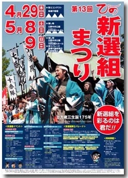 今年も『ひの新選組まつり』の季節がやってきました 例年通り、今年もプチ旅コミュとしてイベント発動します ■第13回ひの新撰組まつり http://makoto.shinsenhino.com/archives/fes/100414203933.php 今年も総勢約600名からなる「新撰組パレード」開催日をイベント日程として参戦します。 前回、前々回ともに史料館巡りでの行程でしたので、今年は催しイベント(もちろんコスプレも)観賞を中心にした行程で、楽しめたらいいなぁ〜と考えています ●去年の「ひの新撰組まつり」ツアーのフォトアルバム