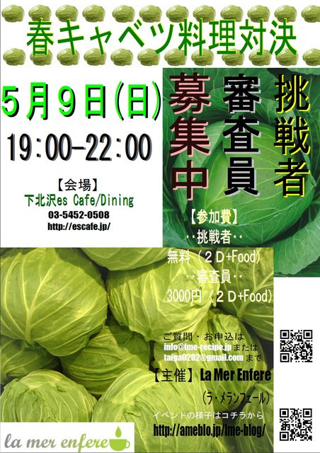 第15回!レシピ対決☆ 旬の食材、春キャベツを使ったレシピ対決ですよー^^ 今回もみんなでワイワイしながら楽しみましょう! 毎回異なるテーマを設定し、テーマに沿った料理をみんなで楽しむイベントです このイベント、普段料理を作る方もそうでない方も楽しめます というのもイベントは挑戦者と審査員に分かれて開きます! 挑戦者は3〜5名、その場で挑戦レシピを作ってもらいます☆ 審査員は20〜30名、挑戦レシピを食べて点数をつけます☆ 料理を作るのが好きな方、振舞うのが好きな方は挑戦者、食べるのが好きな
