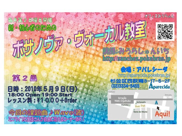 みなさん、こんにちは! オフィスみうらぉん、コウです。 4月のリニューアル第1回も、たくさんの方に参加いただきました! ありがとうございます。 さあ、 「ボサノヴァに興味がある」「ちょっと歌ってみたい」と思っている方にぴったりの当イベント、第2回のお知らせです!!(毎月第2日曜日開催) 予習はいりません、楽譜を読める必要もありません。とにかく生ギターの伴奏で楽しく歌って、ボサノヴァを体感しましょう!ミニライブと生徒さんが自由に歌えるコーナーもありますよ。 ♪今回の課題曲「波(Wave)」 夏を前に