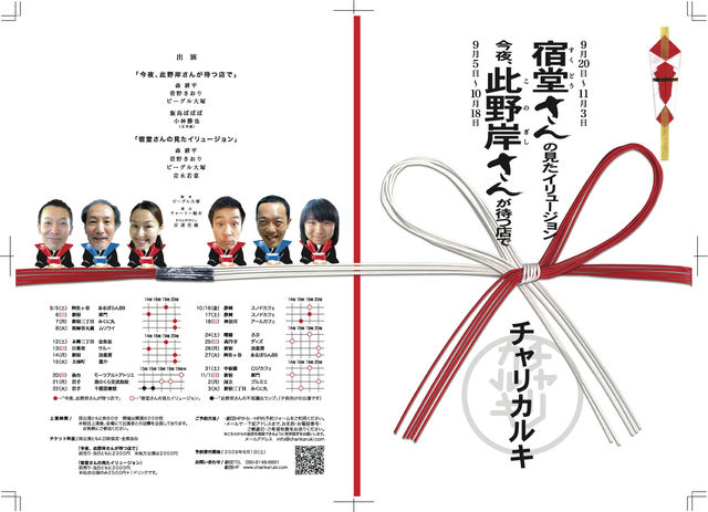Mama-チャリカルキ vol.4 ★今回はなんと!3本もやっちゃうぞ★ 「宿堂さんが見たイリュージョン」(新作) 「今夜、此野岸さんが待つ店で」(番外編) 「千厩図書館の子供達〜コノギシさんの不思議なランプ〜」(岩手公演のみ!) 脚本:ビーグル大塚 演出:チャーリー軽木 【出演】 ?「宿堂さんが見たイリュージョン」(新作) -------------------------------- ビーグル大塚 森耕平 菅野さおり 青木若菜 店長 ?「今夜、此野岸さんが待つ店で」(番外編) -------------------------------- ビーグル大